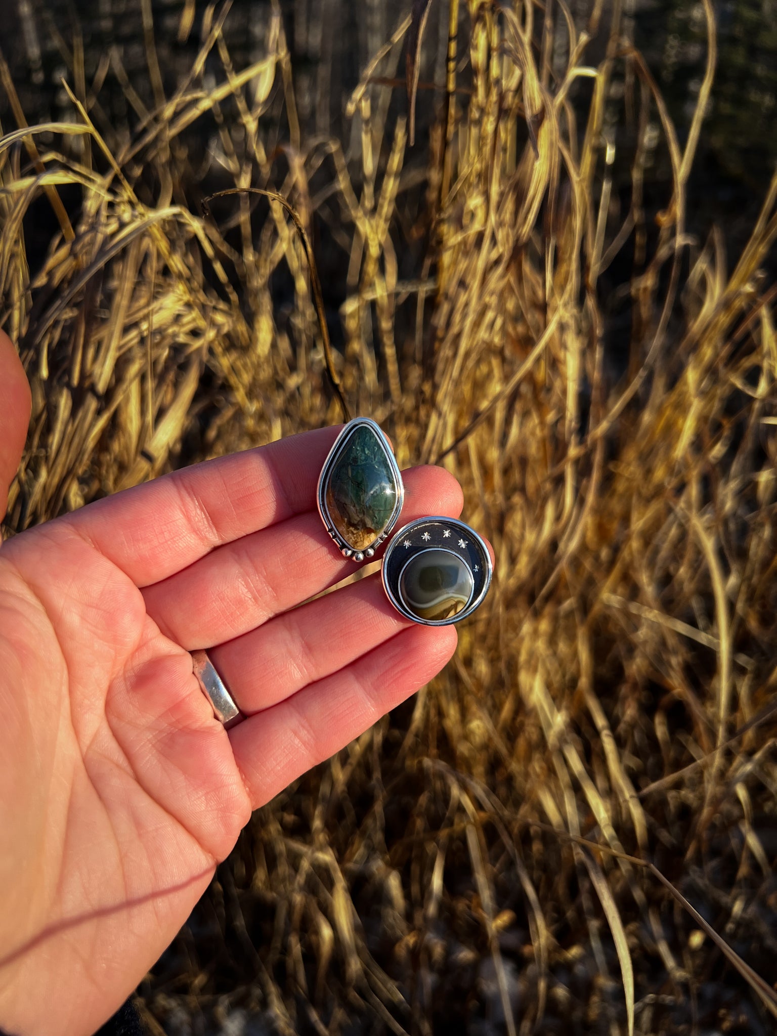 This scenic Hart Mountain Jasper was mined in Oregon. I purchased the rough material directly from the miner and then hand cut and polished it into what you see here. I then slowly crafted it into this ring using recycled sterling silver and traditional techniques - here in the mountains of Alaska.